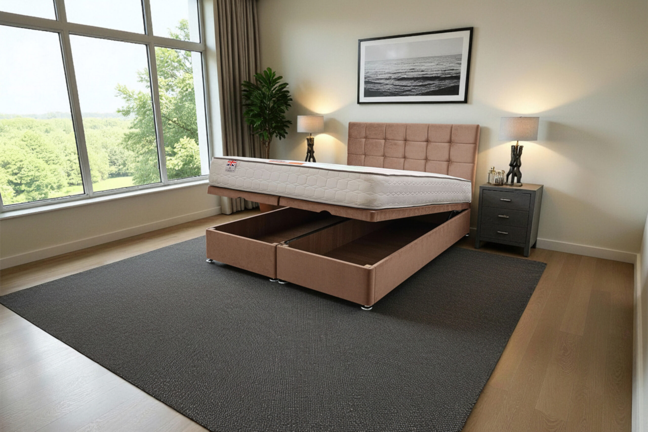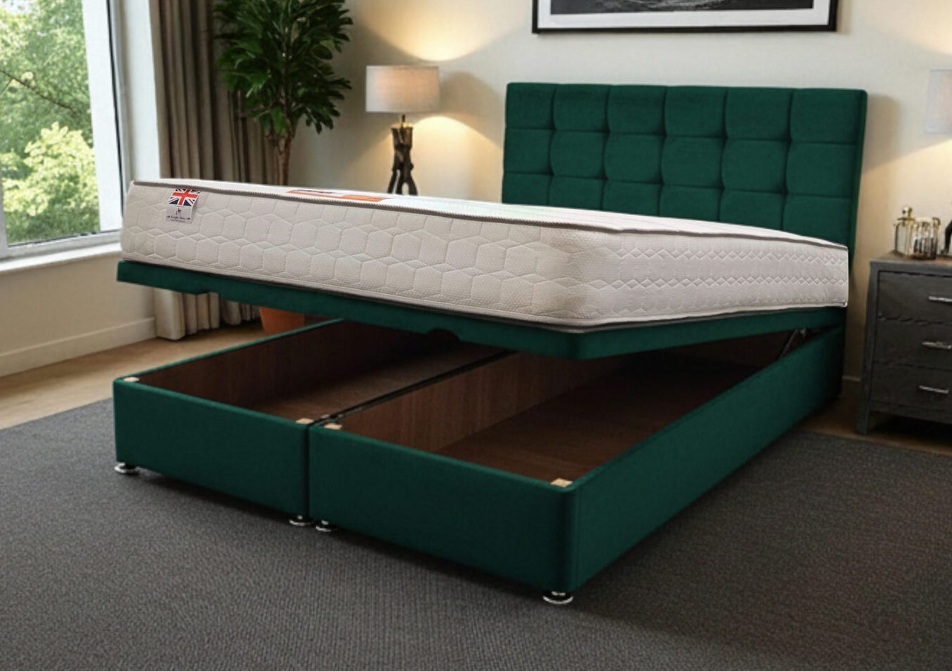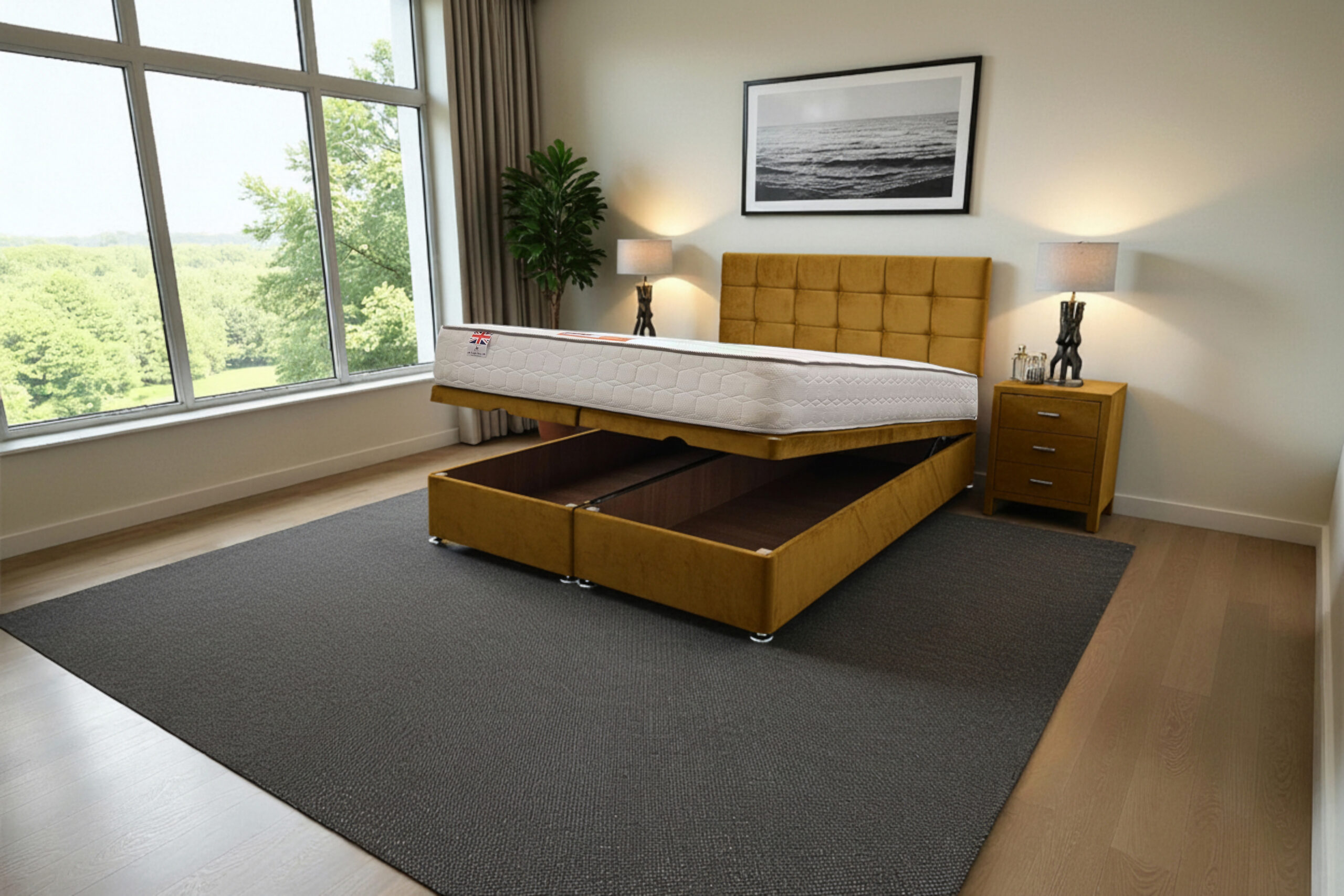 Our Ottoman Gas Lift Bed is a premium-quality, space-saving solution designed for comfort, durability, and modern living. Built with a strong wooden frame and reinforced base, it offers a firm, flat surface that supports all UK standard mattress types, helping to prolong mattress life. You can fully personalise your bed by selecting from a wide range of luxurious fabrics, colours, and sizes – from single to super king – allowing you to match your bedroom décor effortlessly. Instead of drawers, this bed features a powerful metal gas lift mechanism, giving you easy access to a large under-bed storage area – perfect for storing bedding, clothes, or everyday items neatly out of sight. The lift system is smooth and sturdy, allowing you to open and close the storage compartment with minimal effort. The bed comes in two parts (for double size and above) to ensure easy delivery and setup, and includes brackets for simple headboard attachment. Assembly is quick and straightforward – connect the base, fit the gas lift frame, and place your mattress on top. No specialist tools or help required. With thousands of happy customers across the UK, excellent reviews, and fast delivery, our Ottoman Gas Lift Bed is the perfect blend of style, practicality, and premium comfort for any modern bedroom.