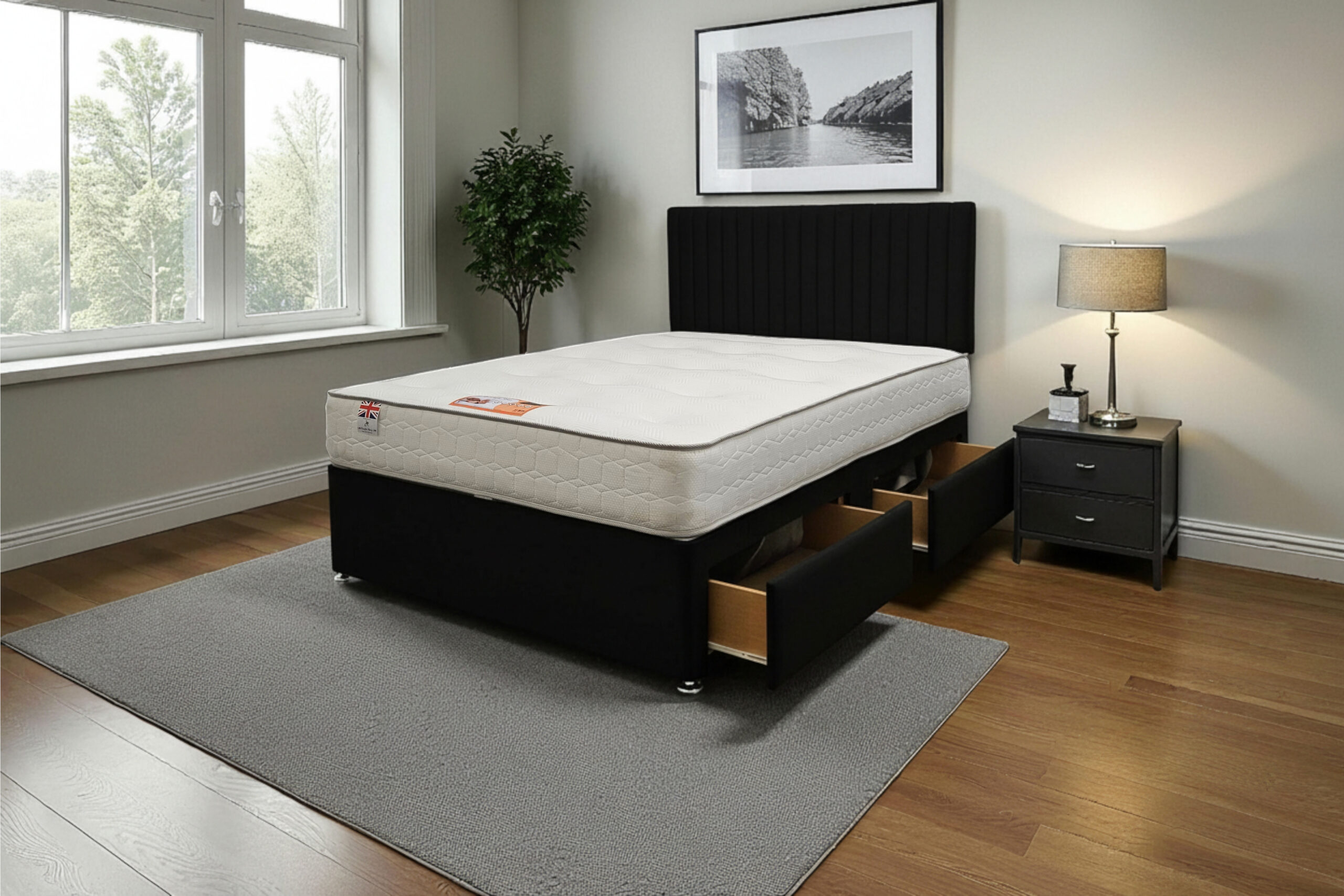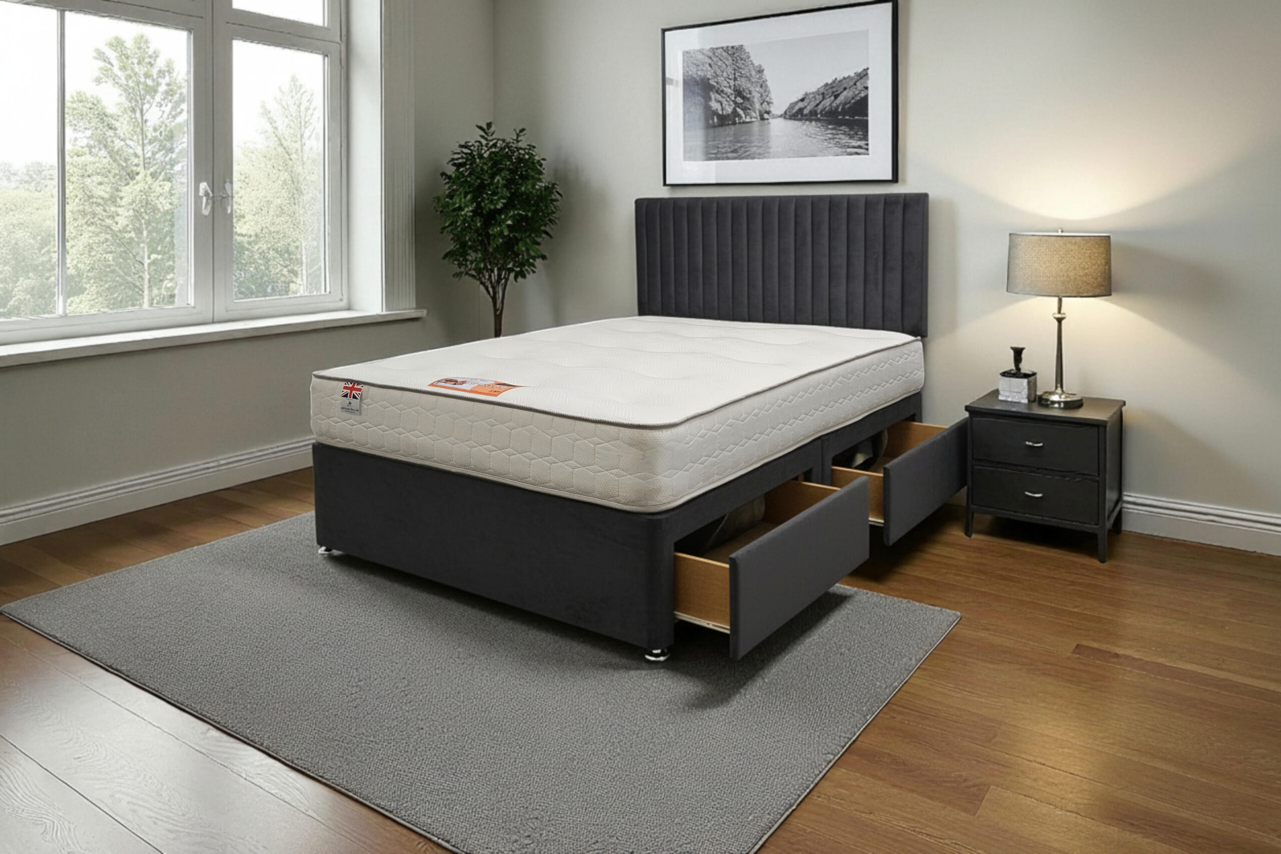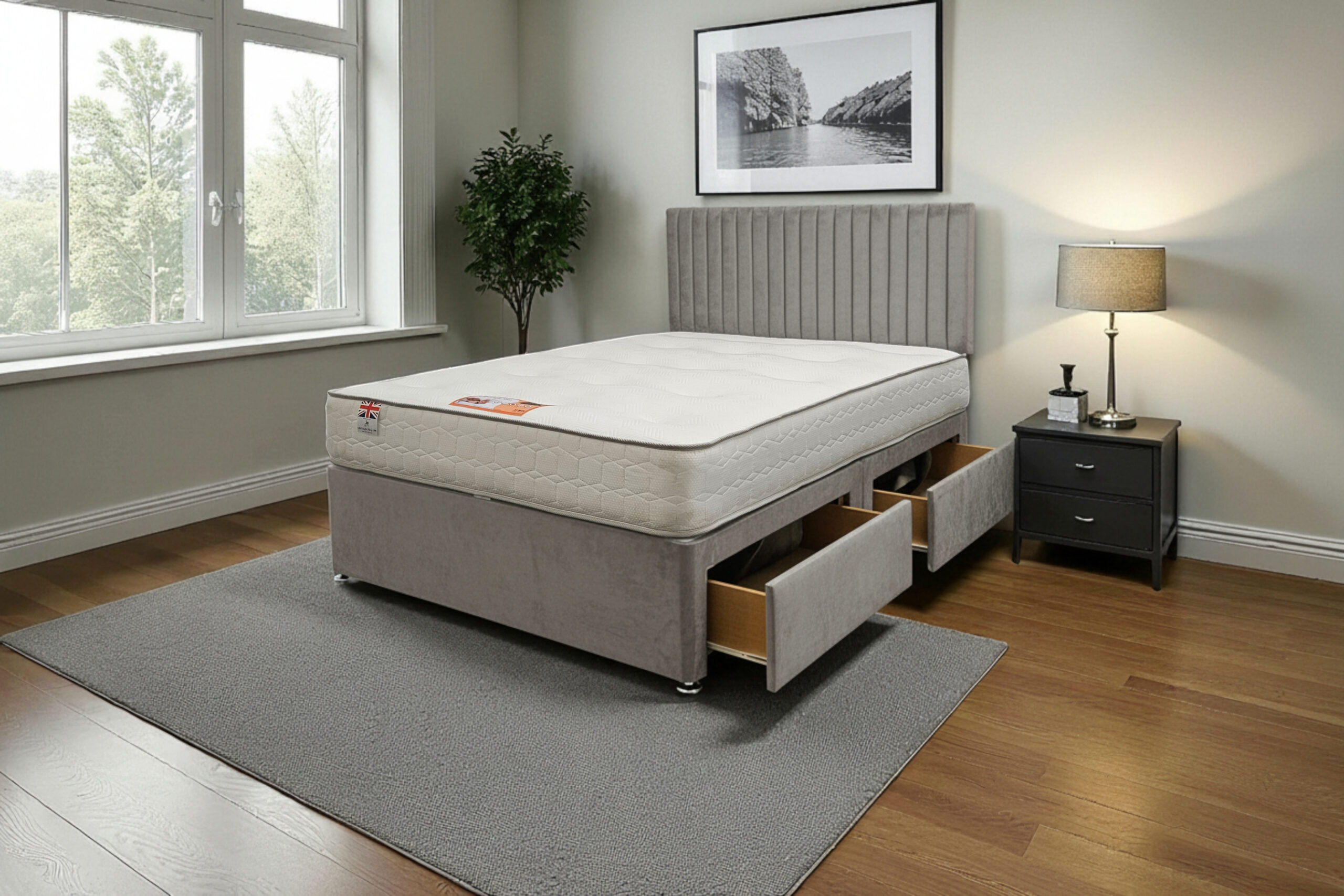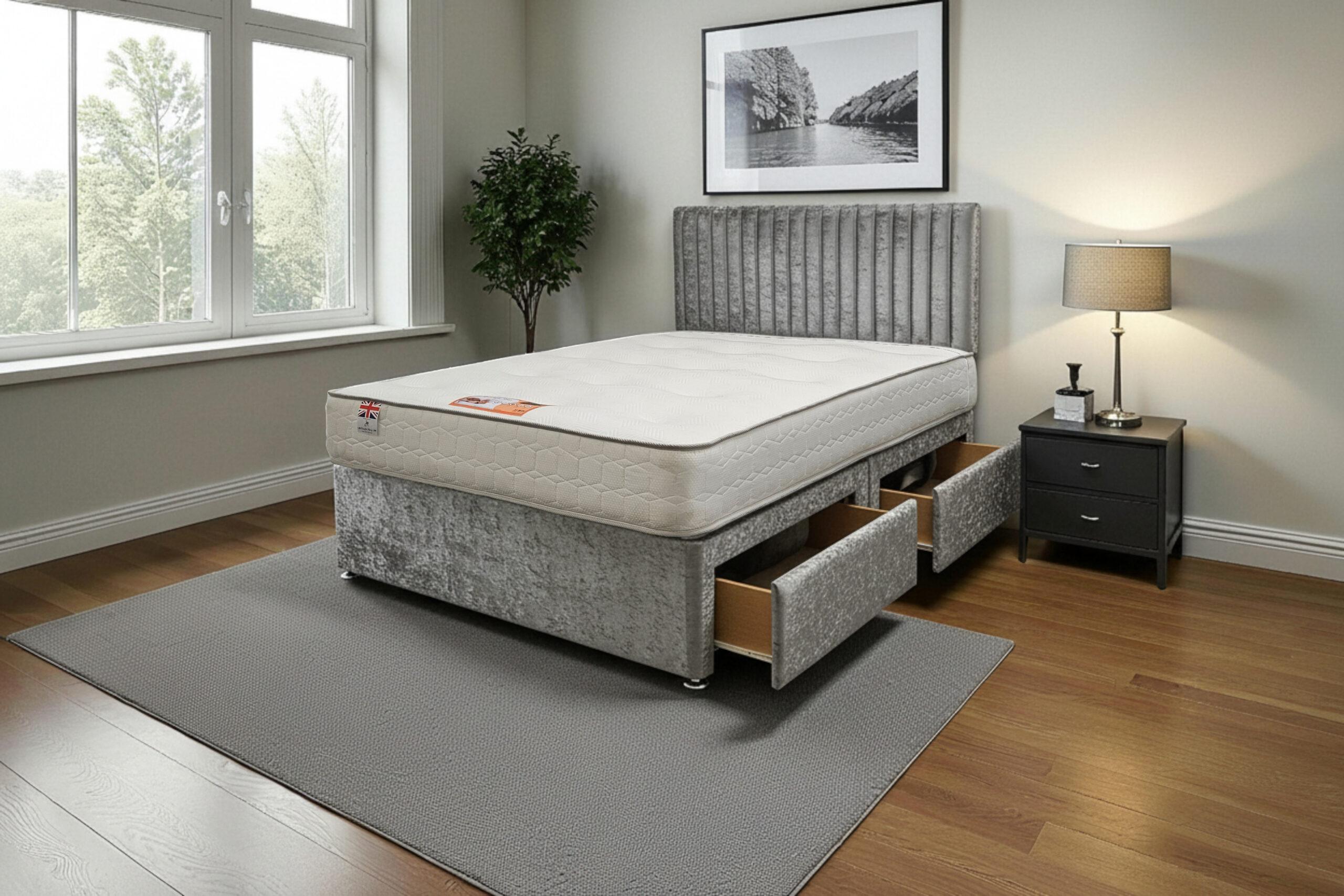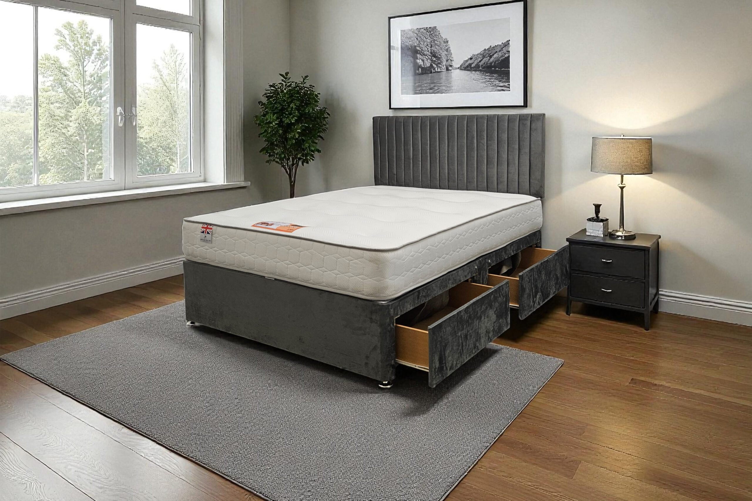 Our Emily Divan Bed is a premium-quality, customisable solution designed for comfort, durability, and modern living. Made with a strong wooden frame, it provides a firm, flat surface that supports all UK standard mattress types and helps extend mattress life.