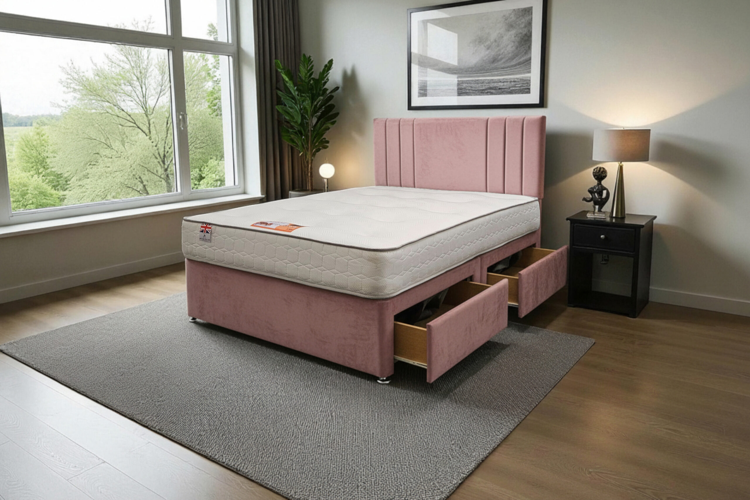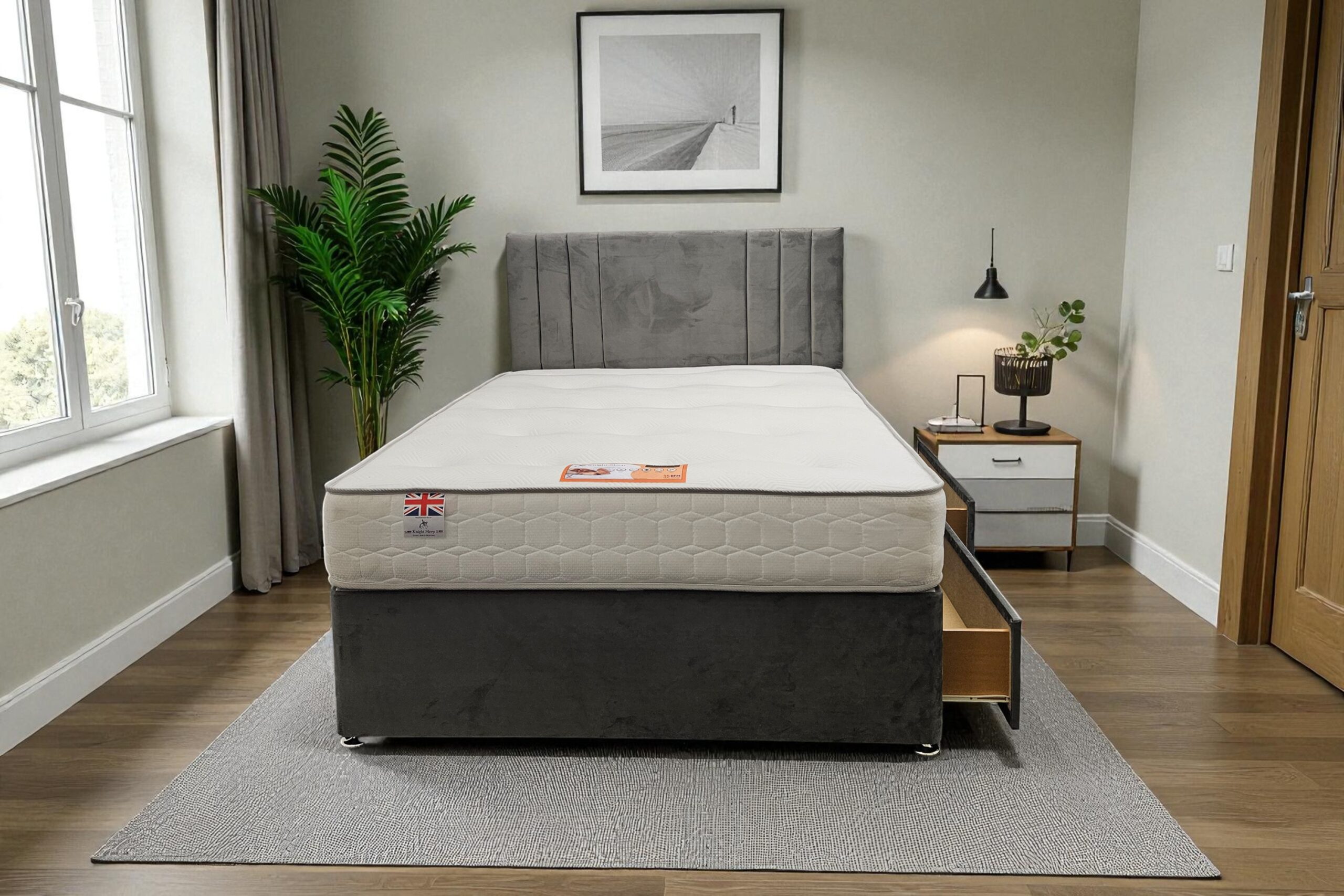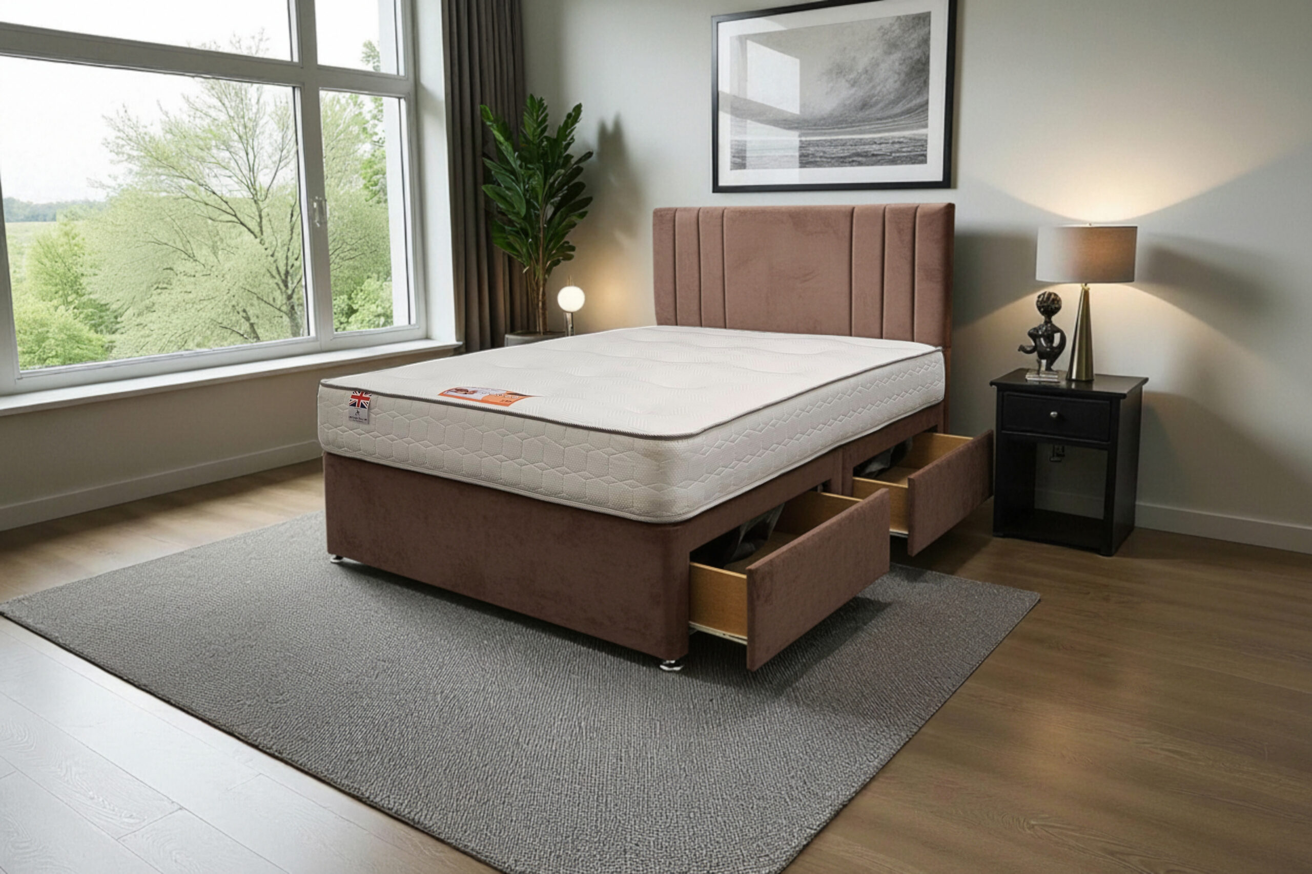 Our Sarah Divan Bed is a premium-quality, customisable solution designed for comfort, durability, and modern living. Made with a strong wooden frame, it provides a firm, flat surface that supports all UK standard mattress types and helps extend mattress life.