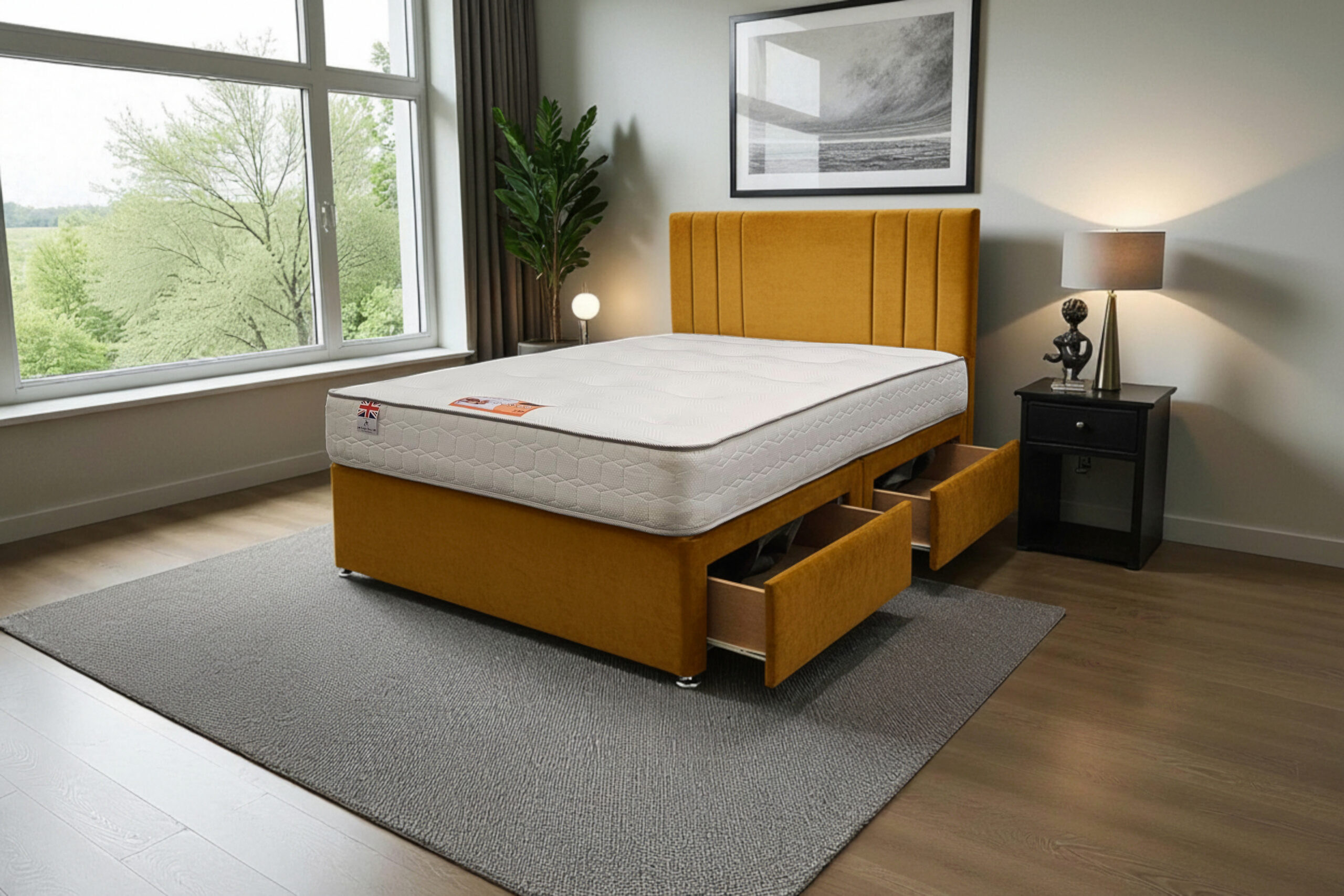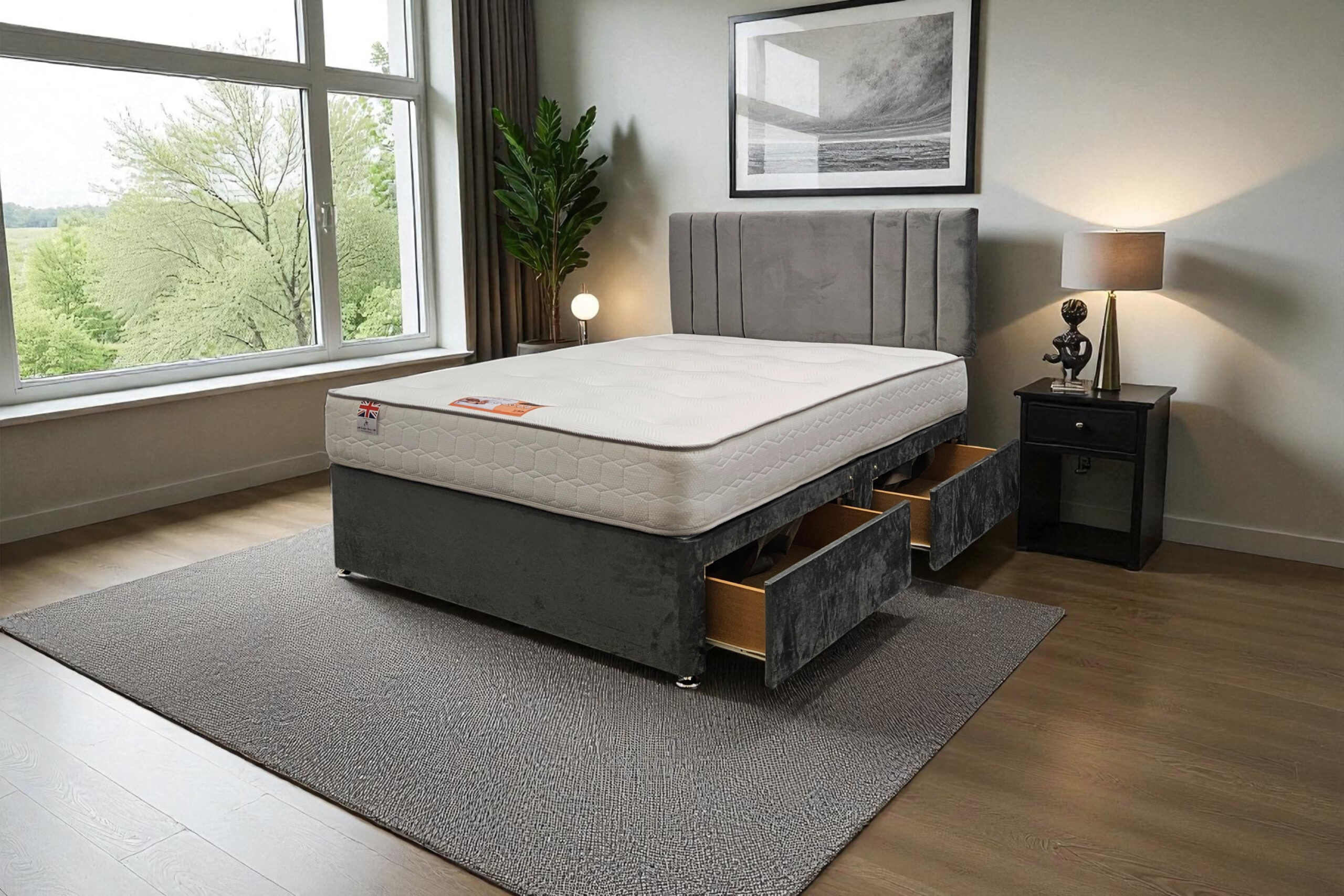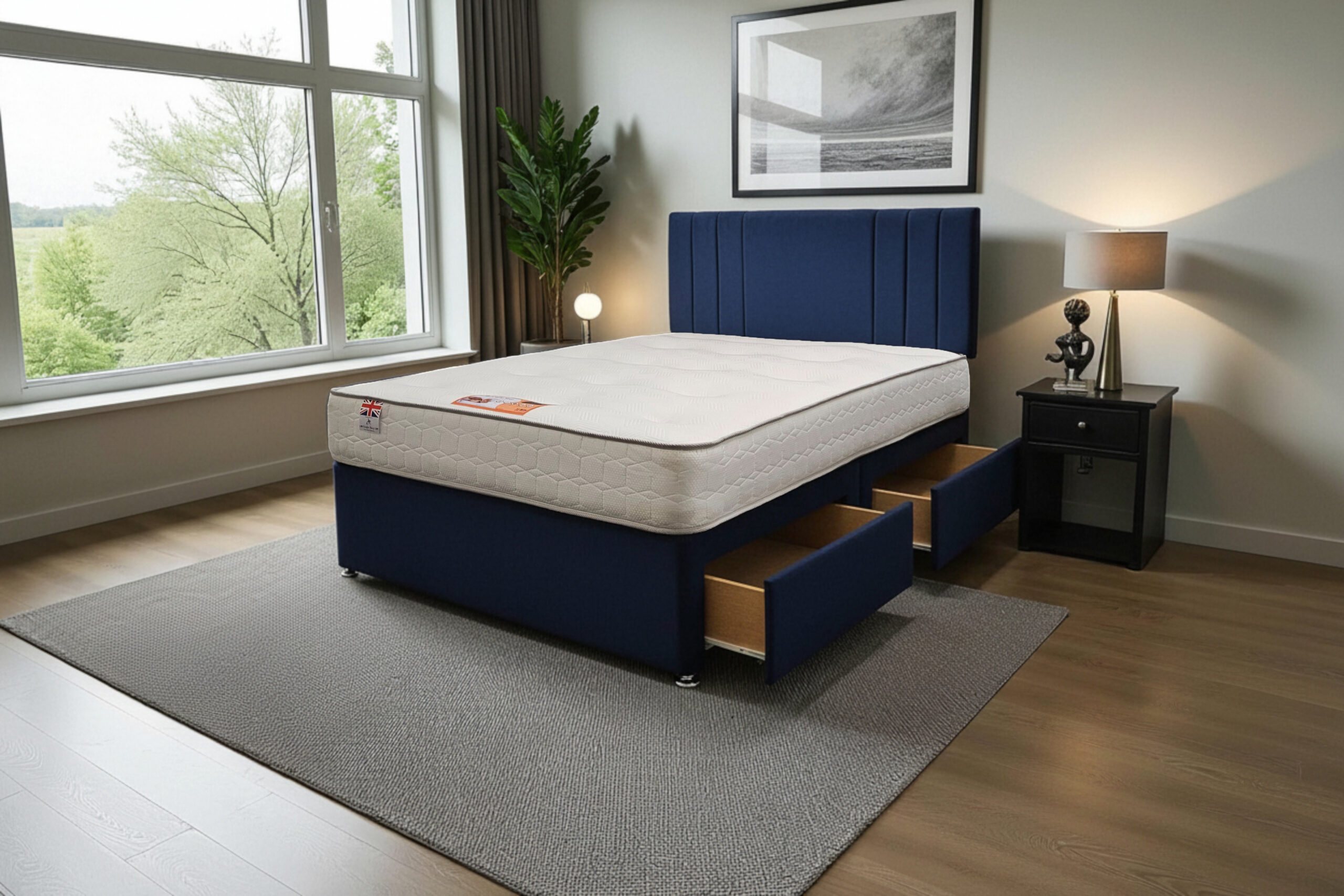 Our Sarah Divan Bed is a premium-quality, customisable solution designed for comfort, durability, and modern living. Made with a strong wooden frame, it provides a firm, flat surface that supports all UK standard mattress types and helps extend mattress life.